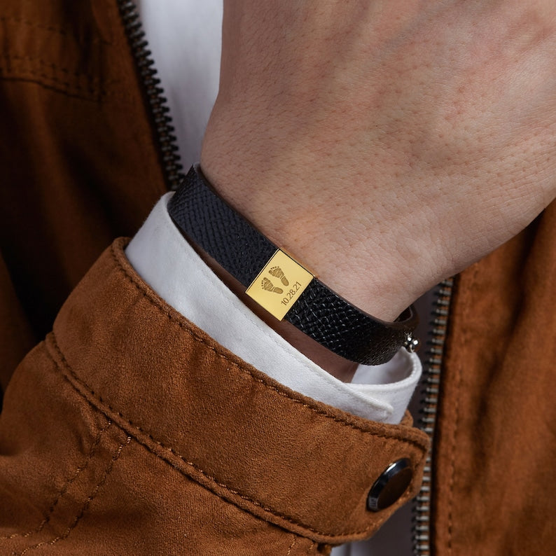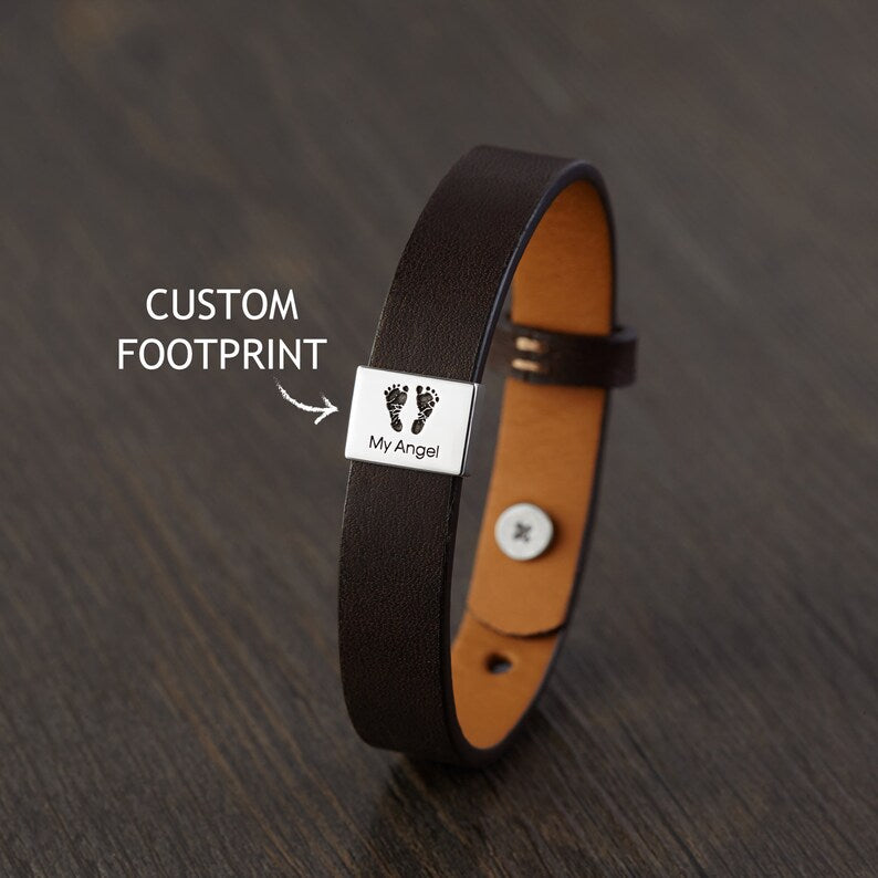 Capture those precious early moments forever with this Baby Handprint Band Bracelet. Featuring your baby's handprint (actual or template), name or birthdate on a sterling silver charm, this leather bracelet is a touching keepsake. Personalize the back with a custom phrase or another footprint for an extra special touch.