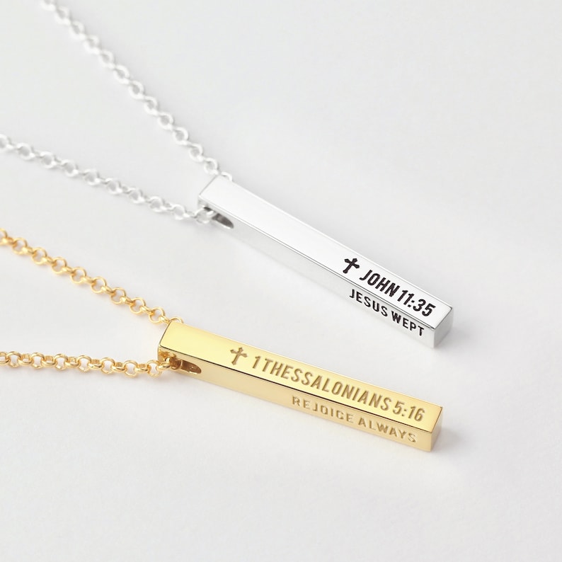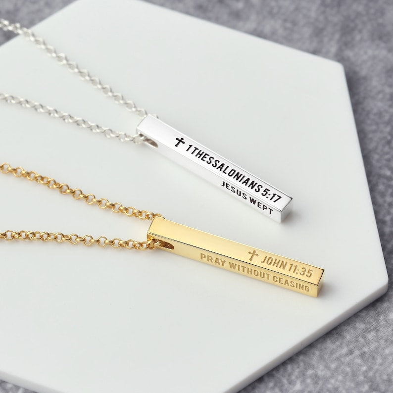 Carry the word of God close with these personalized Bible Verse Necklaces for Men. Engrave up to four sides with a chosen verse for a deeply meaningful and spiritual gift, perfect for holy communion, Christmas, or any occasion of faith.