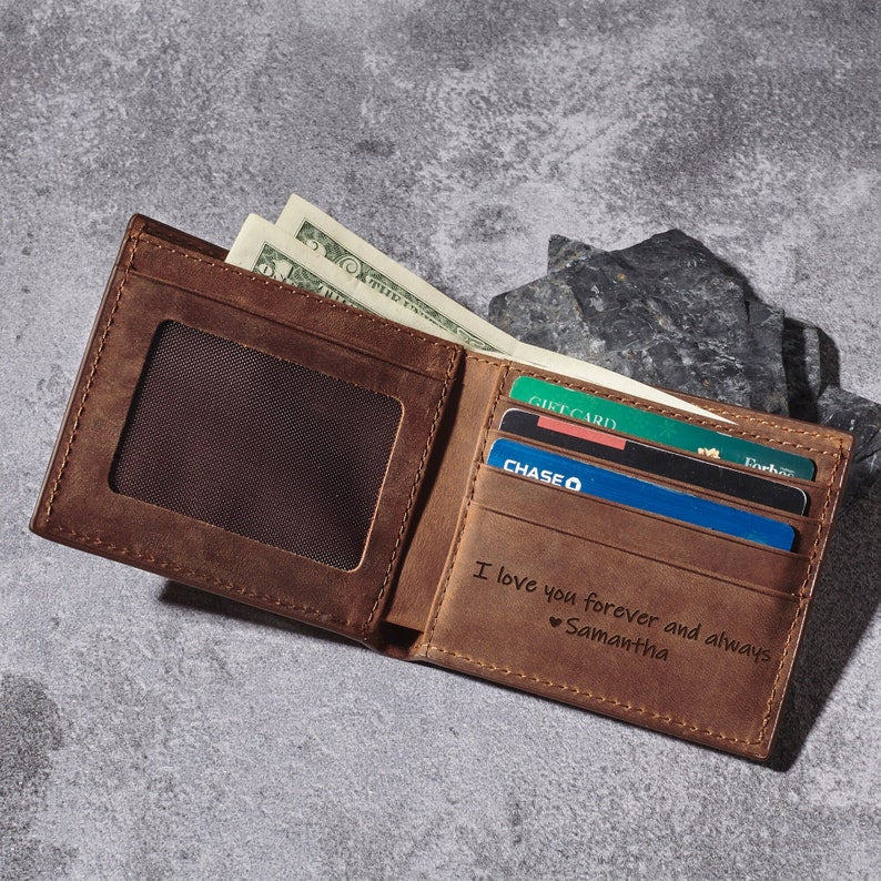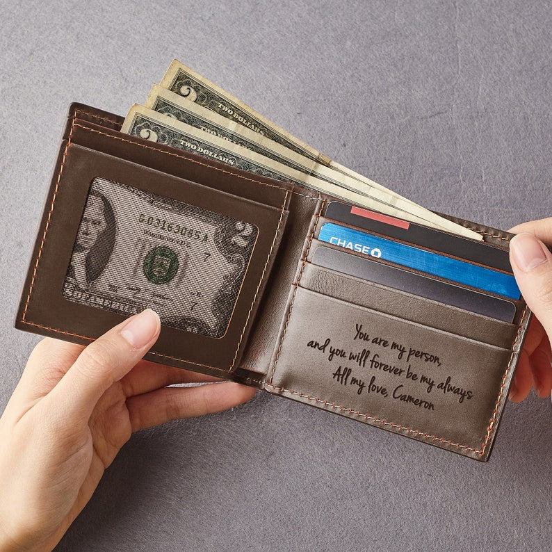 This Personalized Boyfriend Wallet is more than just an accessory; it's a tangible expression of your love. Personalize it with his monogram and a heartfelt message inside (up to 20 words) to create a truly special keepsake he'll carry close to his heart. It's a perfect gift for those who value the sentiment behind a gift.