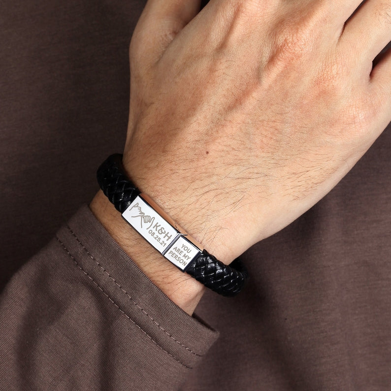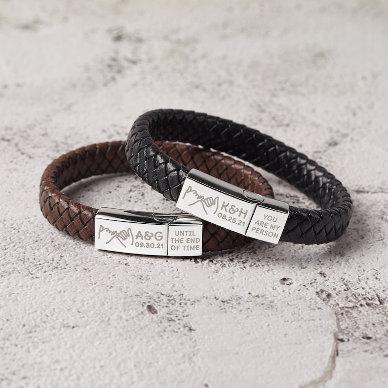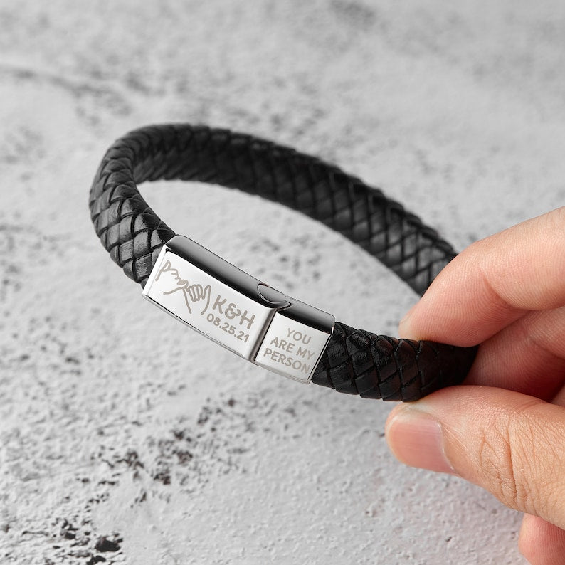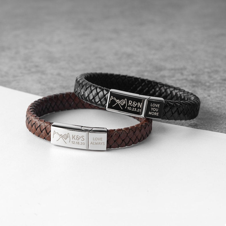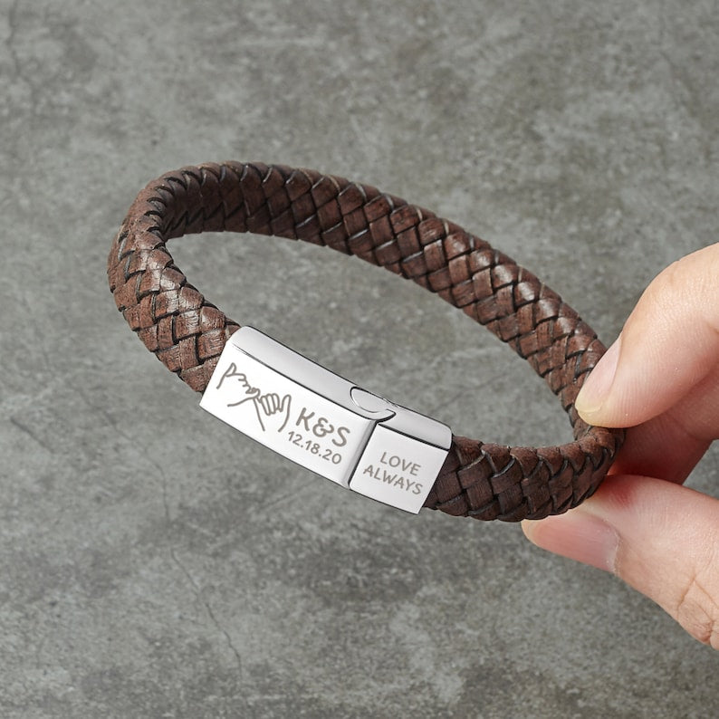 Seal your love and promises with our Braided Bracelet with Pinky Promise, a meaningful custom couple gift he’ll cherish forever. Designed with sleek braided leather and a polished clasp, this men’s custom bracelet is a heartfelt symbol of your bond. Personalize it with your initials, a special date, or a sweet message to create a one-of-a-kind gift for your boyfriend, husband, or someone special. Whether it’s to honor a pinky promise, celebrate an anniversary, or just show your love, this timeless piece is the perfect keepsake to keep your connection close, every single day.
