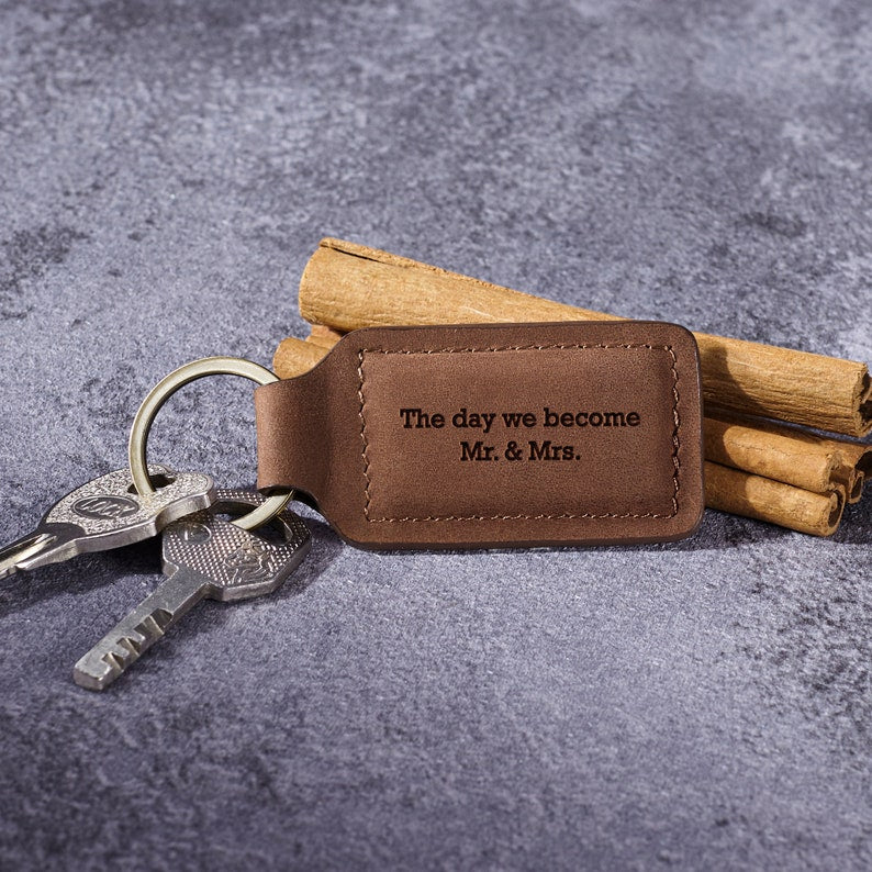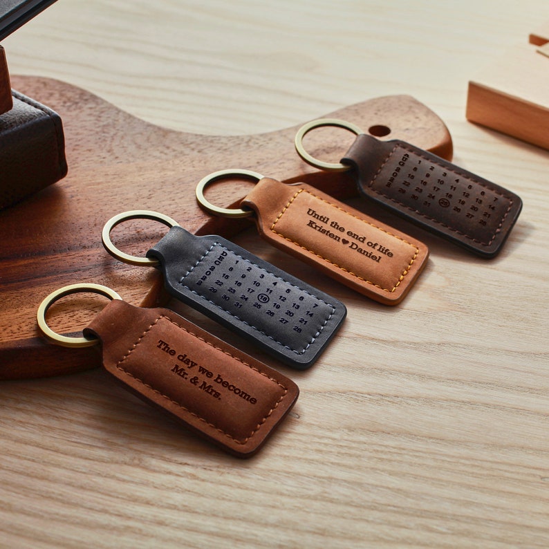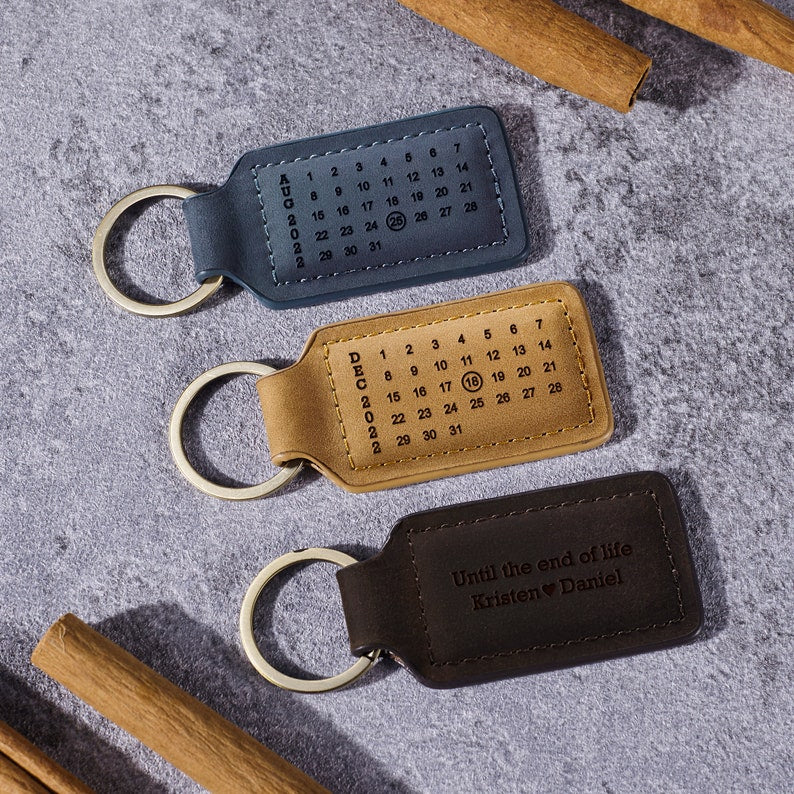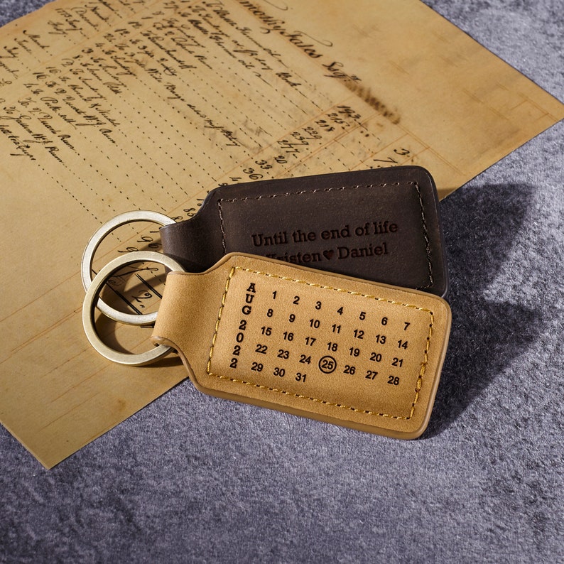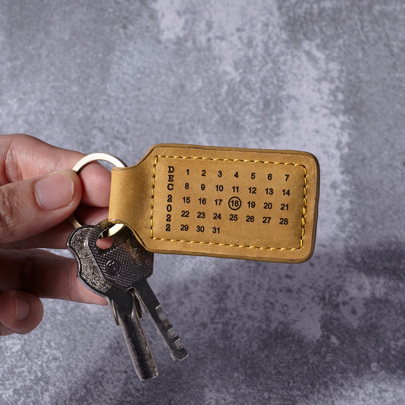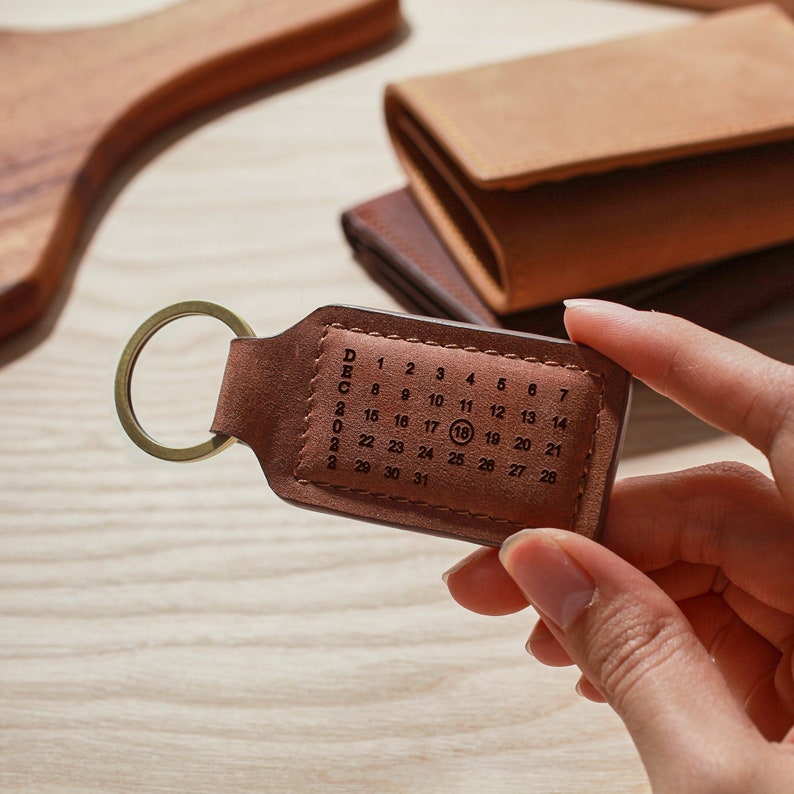 Give the gift of a daily reminder of your love and commitment with this unique Save the Date keychain. Crafted from genuine leather, it features an engraved calendar with your special date lovingly circled. Every time your loved one reaches for their keys, they'll be reminded of the promise you share. A personalized message on the back adds an extra layer of meaning, making it a truly cherished keepsake.