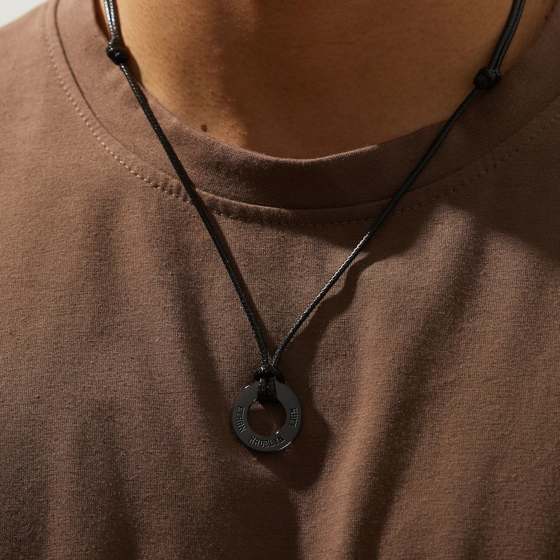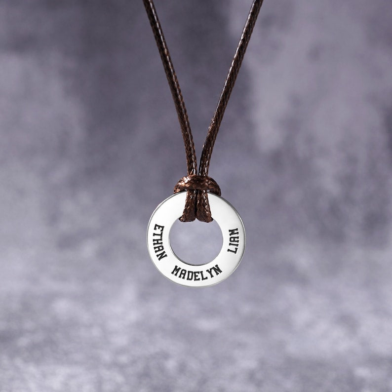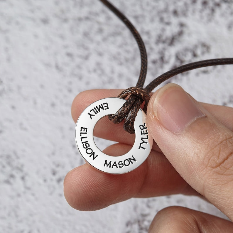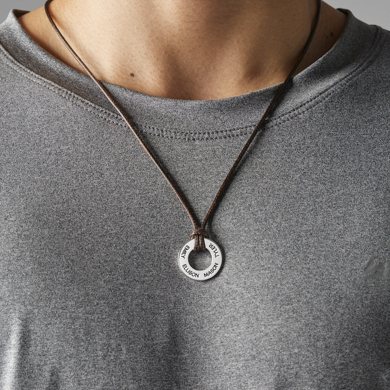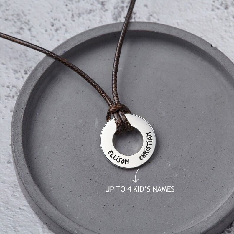 This Dad Necklace With Kids Names features an elegant circular pendant holing up to four engraved names, a constant reminder of his precious children. Personalize the back with a short, loving message—a special date, a cherished inside joke, or a simple "I love you"—to create a truly unique and heartfelt keepsake for any occasion.
