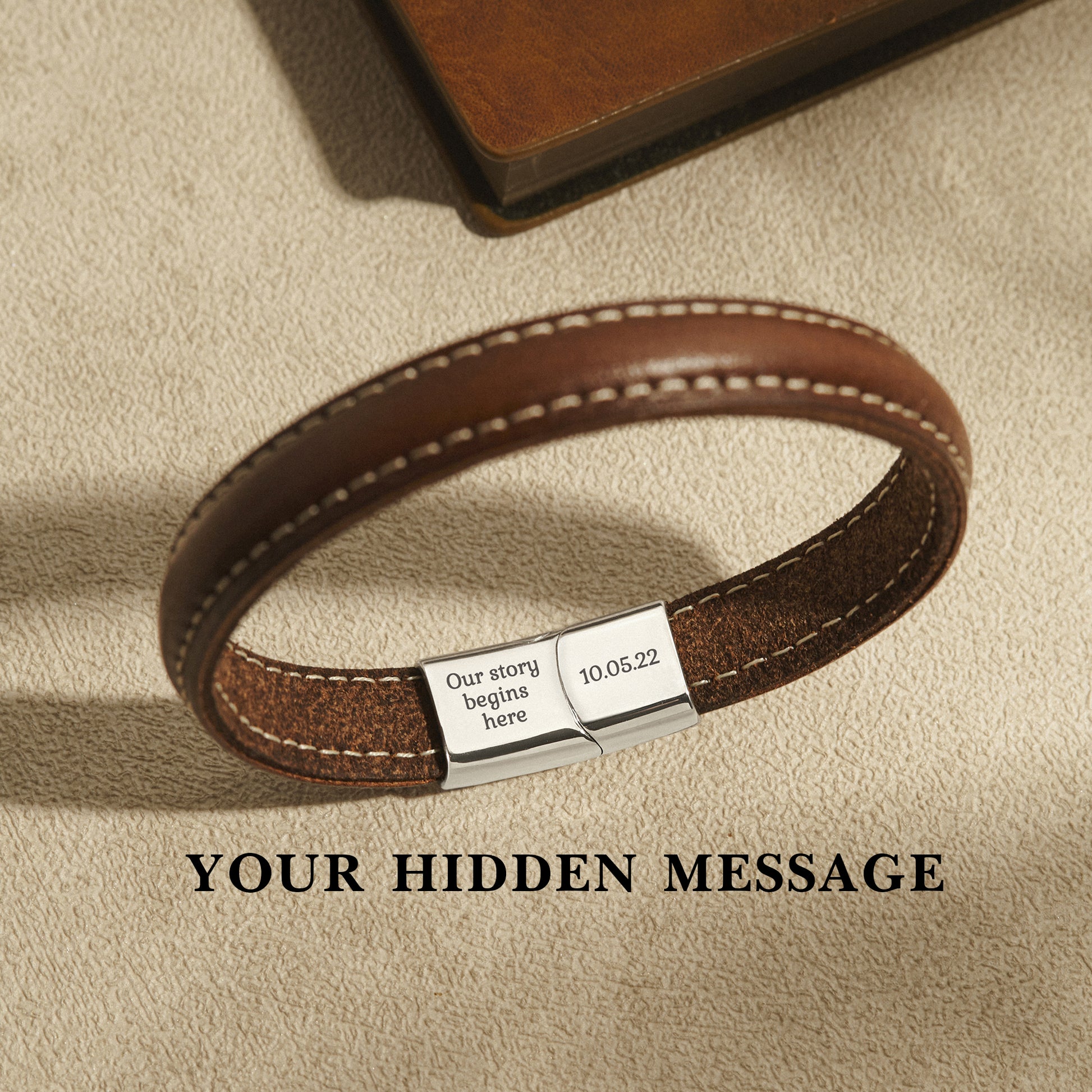 This Men's Italian Leather Bracelet is a refined and meaningful piece crafted for the man you love. Featuring premium Italian leather and a sleek clasp engraved with a hidden personal message, it’s a subtle yet heartfelt way to keep your words close to him every day. Perfect as a secret message bracelet for anniversaries, Christmas, birthdays, or any special moment, this timeless accessory makes a memorable gift for your boyfriend, husband, or partner.