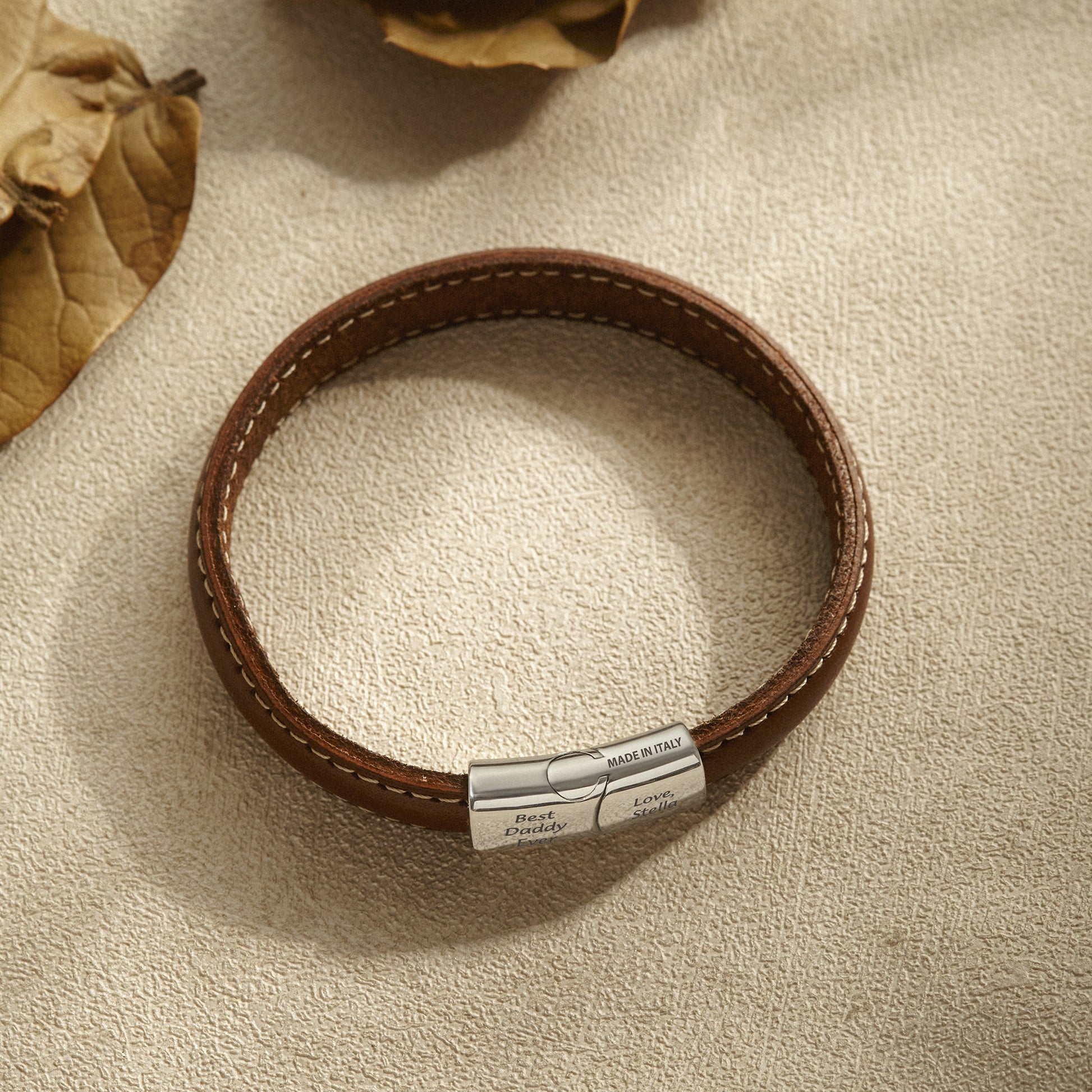 This Men's Italian Leather Bracelet is a refined and meaningful piece crafted for the man you love. Featuring premium Italian leather and a sleek clasp engraved with a hidden personal message, it’s a subtle yet heartfelt way to keep your words close to him every day. Perfect as a secret message bracelet for anniversaries, Christmas, birthdays, or any special moment, this timeless accessory makes a memorable gift for your boyfriend, husband, or partner.