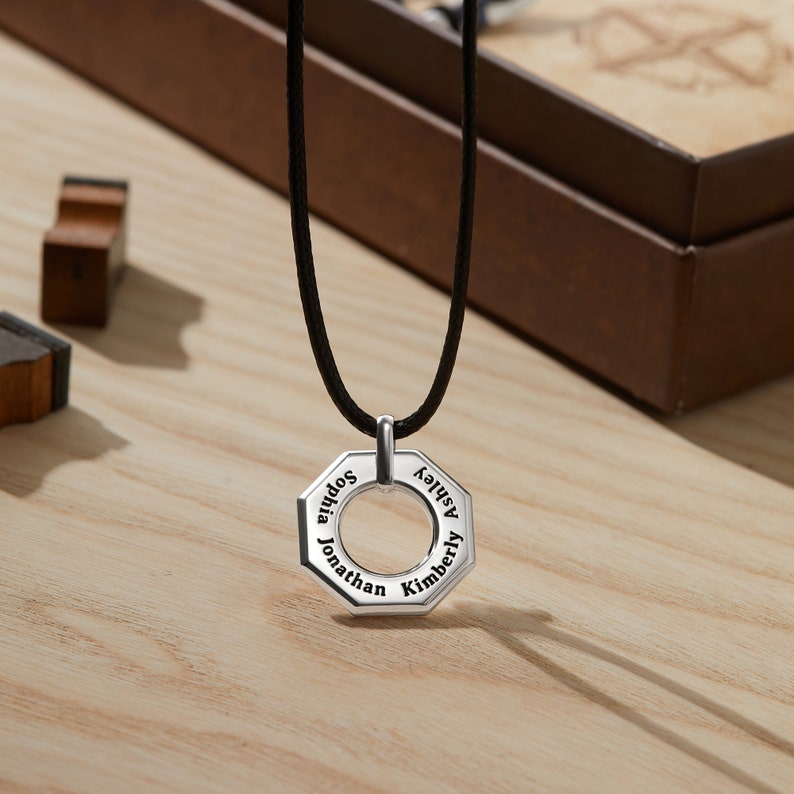 Keep his loved ones close with this touching personalized necklace. The stylish pendant holds up to four engraved names, a constant reminder of his precious children. The comfortable coated leather cord makes it perfect for everyday wear. Available in sterling silver and 14K gold plate, this necklace is a beautiful expression of family bonds, perfect for Father's Day or any day you want to show him how much you care.