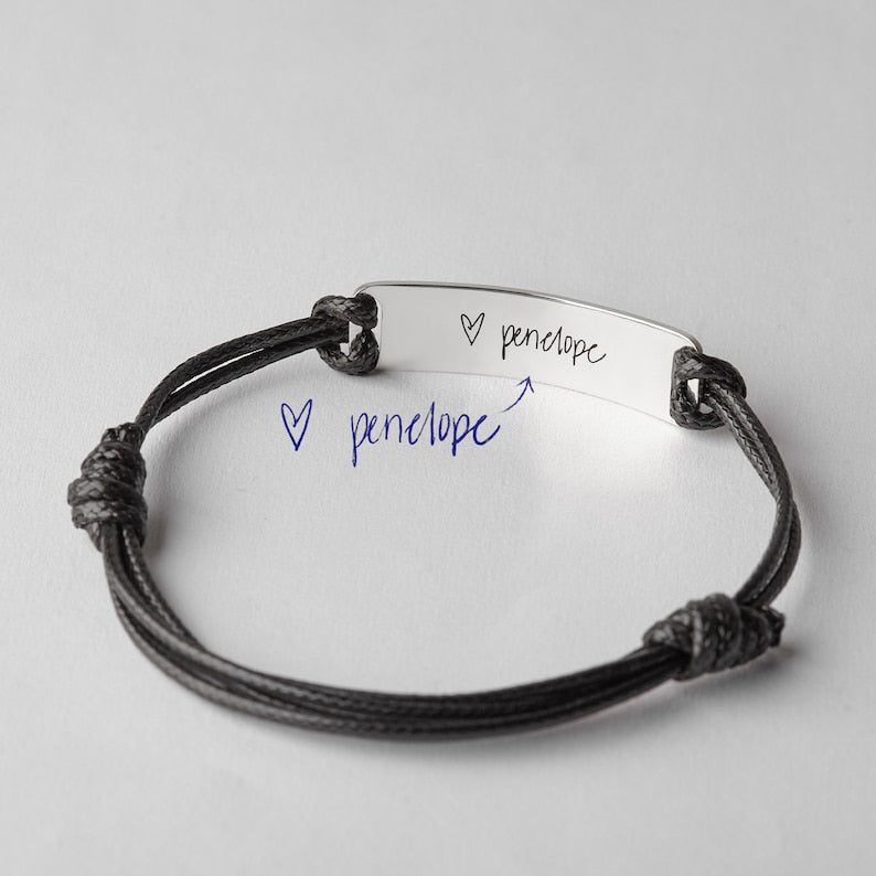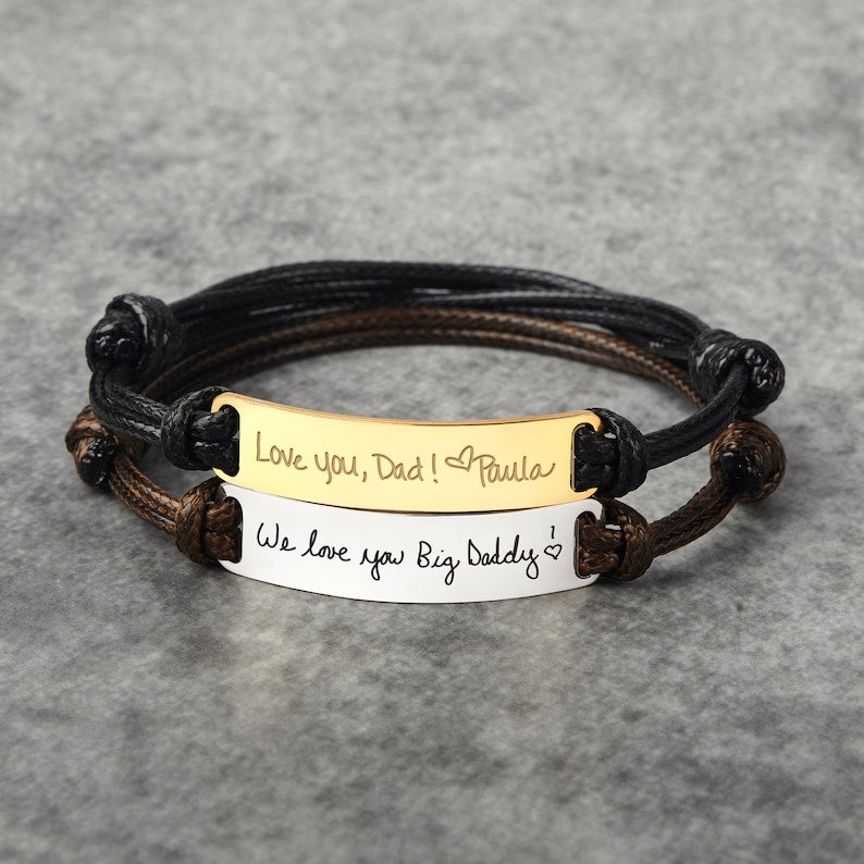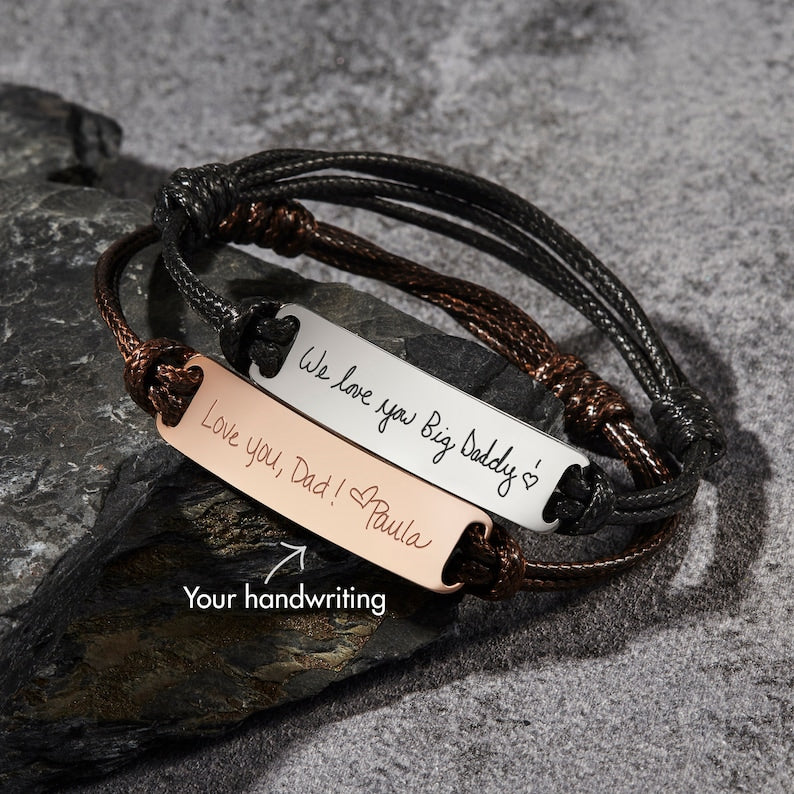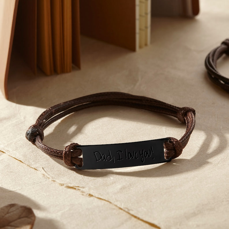 Give a truly personal gift with our Leather Handwriting Bracelet. This thick bar bracelet, crafted from genuine leather, is engraved with actual handwriting, making it a unique and heartfelt present for dads, boyfriends, or sons. Imagine a child's scribble, a loving note, or a cherished message captured forever. This personalized bracelet also offers the option for a back engraving, adding another layer of sentiment. With adjustable knots on both sides, it ensures a comfortable fit for everyday wear.