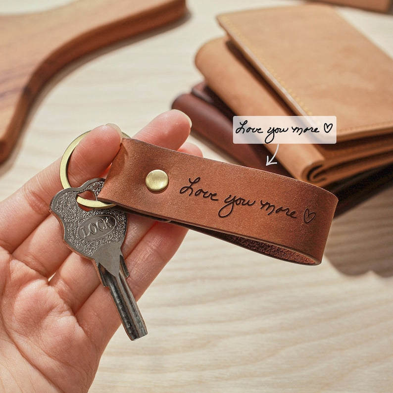 Small handwriting, a world of love. This Leather Handwriting Keychain transforms heartwarming handwritten messages and children's drawings into a tangible expression of affection. Each stroke, each curve, is beautifully captured, creating a deeply personal keepsake he will cherish for good.