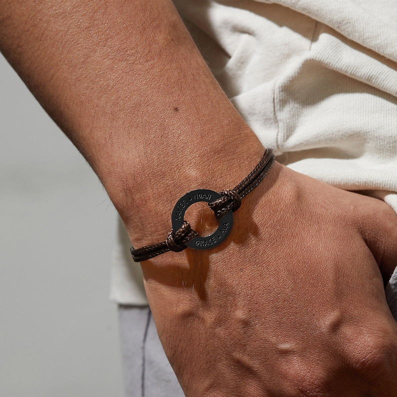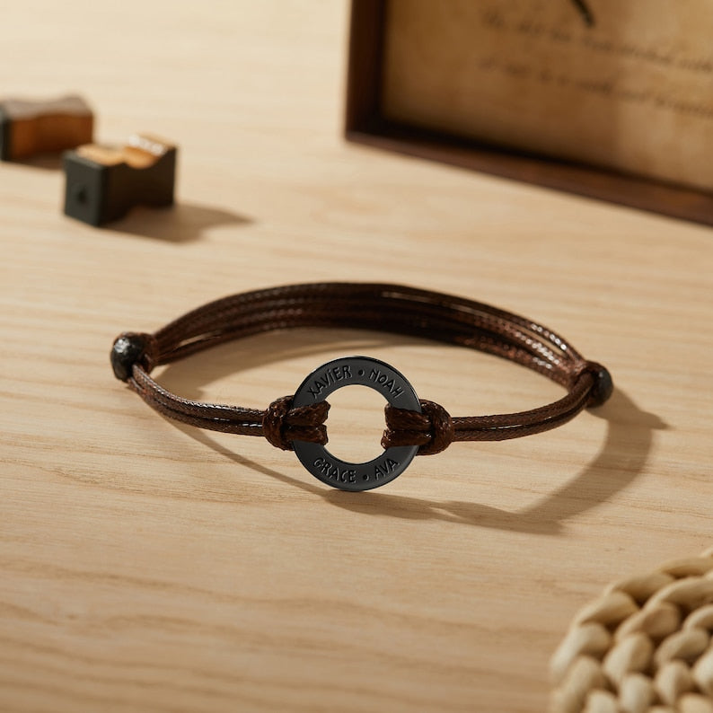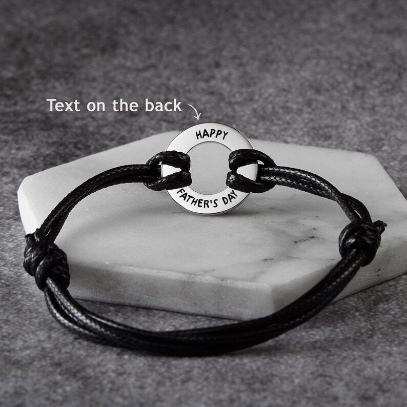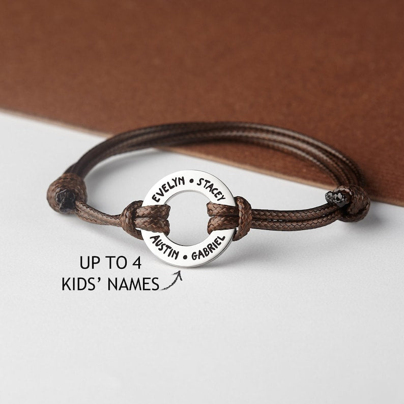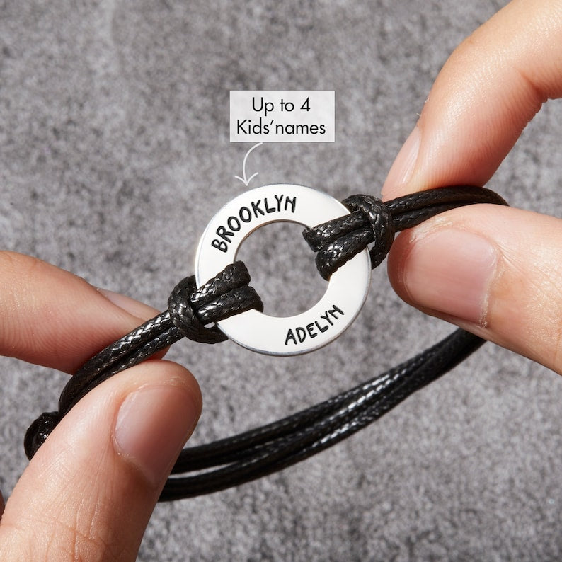 Looking for a truly meaningful gift for the special dad in your life? This Dad Bracelet is a perfect choice. The circular charm, personalized with his children's names, becomes a treasured heirloom, a lasting symbol of the family he cherishes. The leather cord adds a touch of classic style that he can wear every single day.