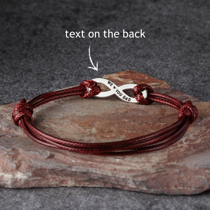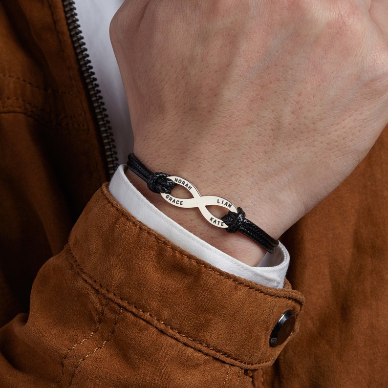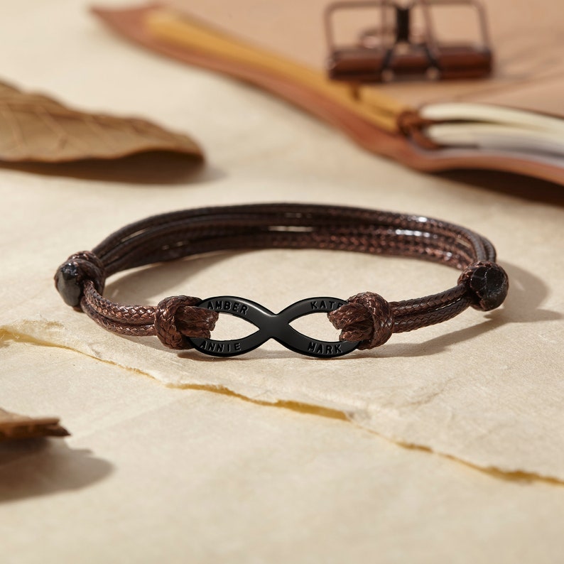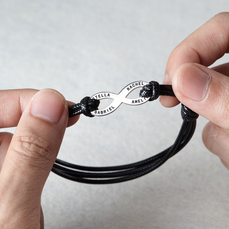 Mark the ties that matter most with this engraved Men's Infinity Bracelet. This leather bracelet features the infinity symbol, engraved with up to four lovely kids' names. A short, personal message can also be added to the back for an extra special touch.