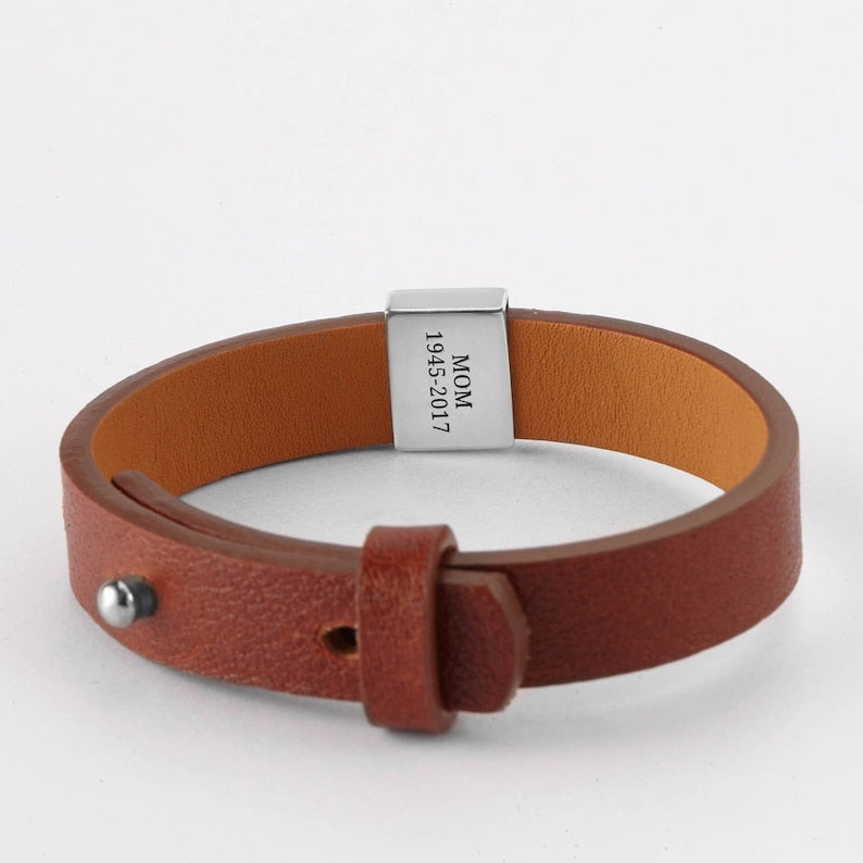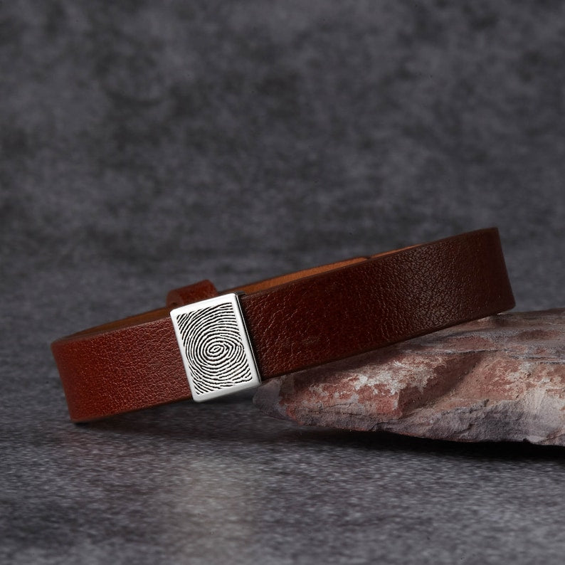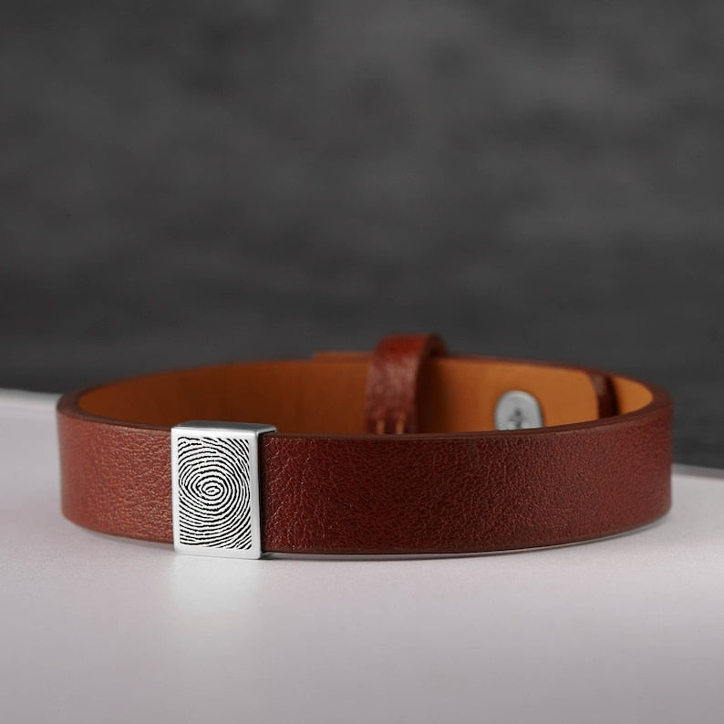 Honor the special bond you share with the men in your life through our Fingerprint Band Bracelet, a touching piece of memorial jewelry. Crafted with a sleek charm and a genuine leather band, this bracelet allows you to engrave the fingerprint on the front and a custom name, phrase, or date (3-4 words) on the back. Ideal for birthdays and anniversaries, this personalized Fingerprint Bracelet is a beautiful reminder of love and memories, making it a truly unforgettable gift.