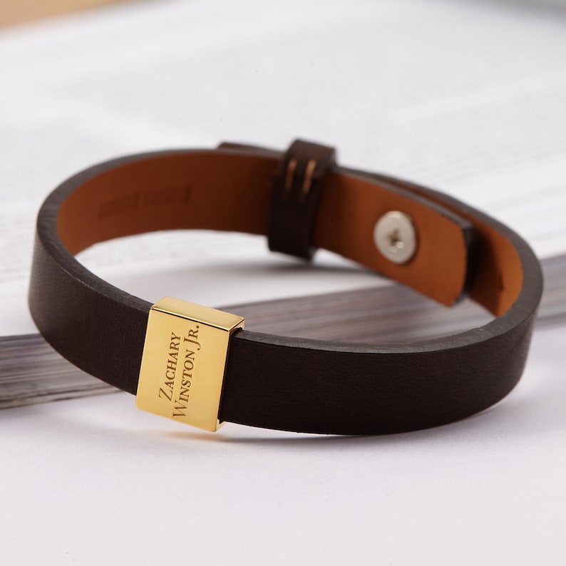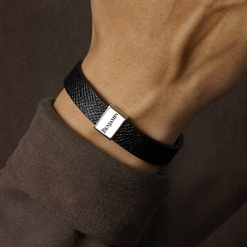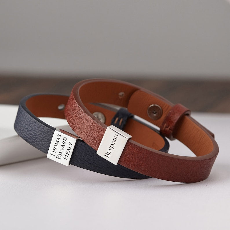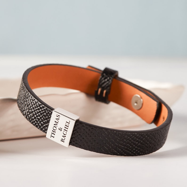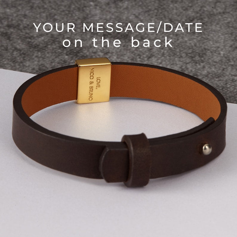 Express a deep connection with this thoughtfully personalized Name Bracelet for Men. This handsome leather bracelet is engraved with names on the front and offers the option to add a personal touch on the back with a short phrase, monogram, name, or date. It's a tangible reminder of the bonds that matter most.