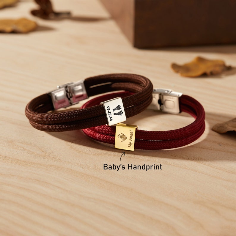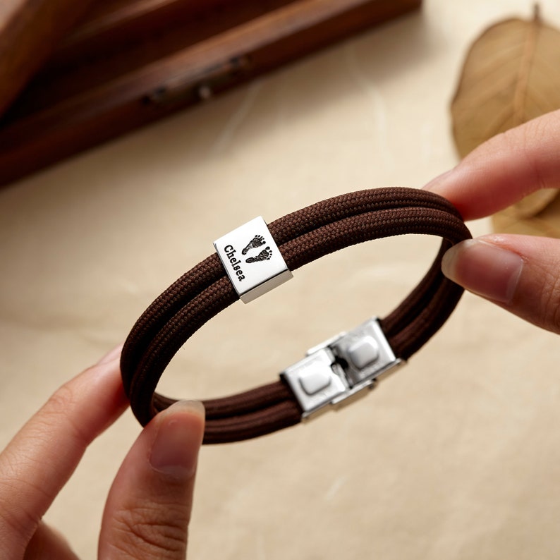 Capture the precious first moments of fatherhood with this deeply sentimental New Dad Bracelet. This bold, masculine bracelet, crafted with durable double paracord, features a touching engraving of your baby's actual footprints or handprint (or a sample print) alongside their name or birthdate. Personalize the reverse side with a custom phrase to create a truly unique and treasured keepsake, perfect for Christmas or any special occasion.