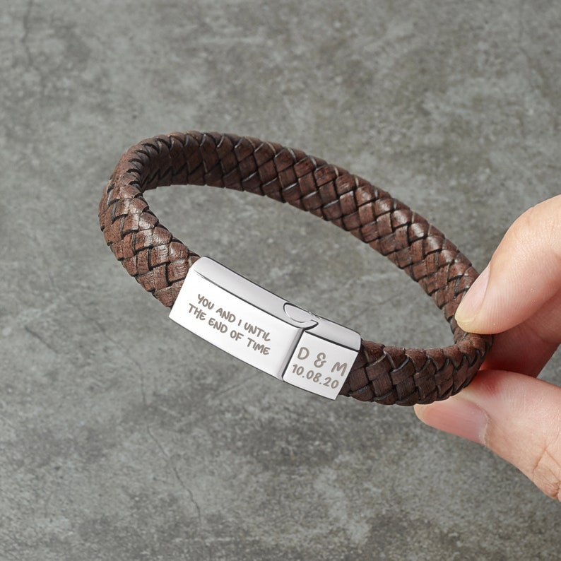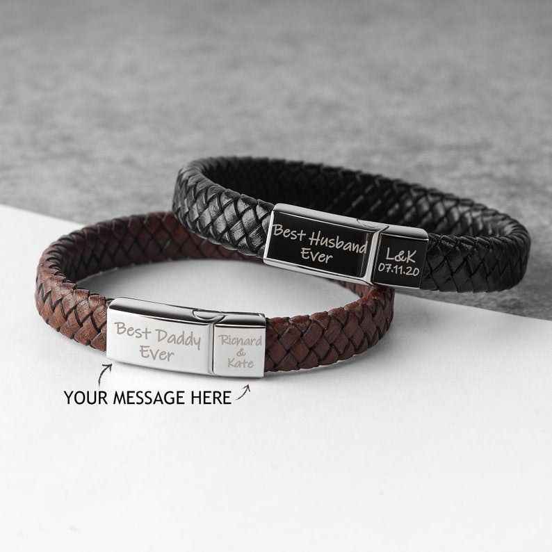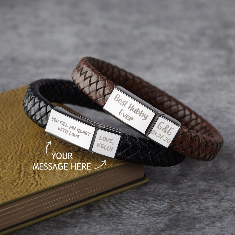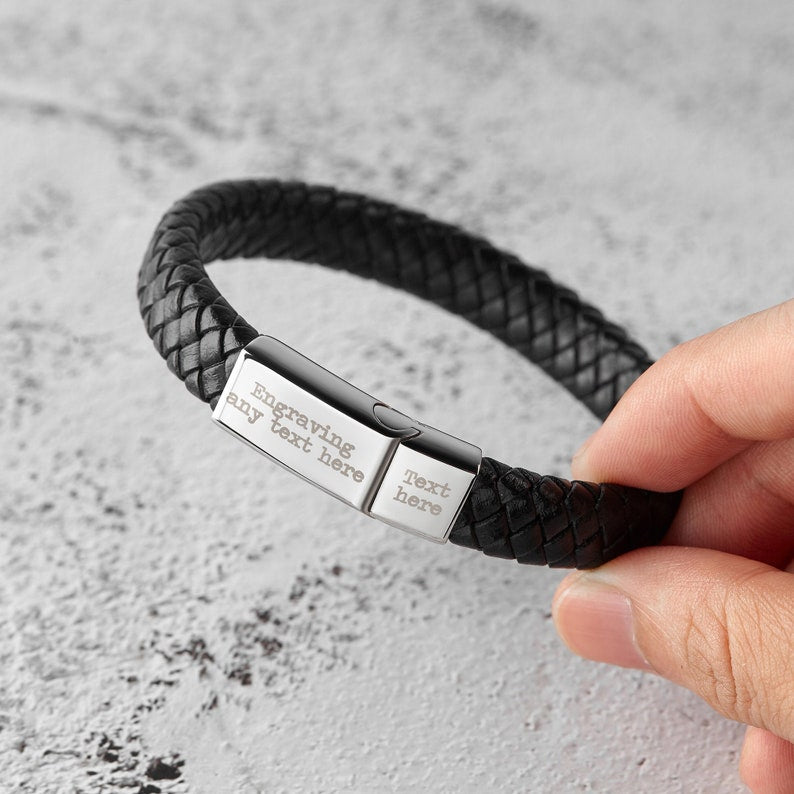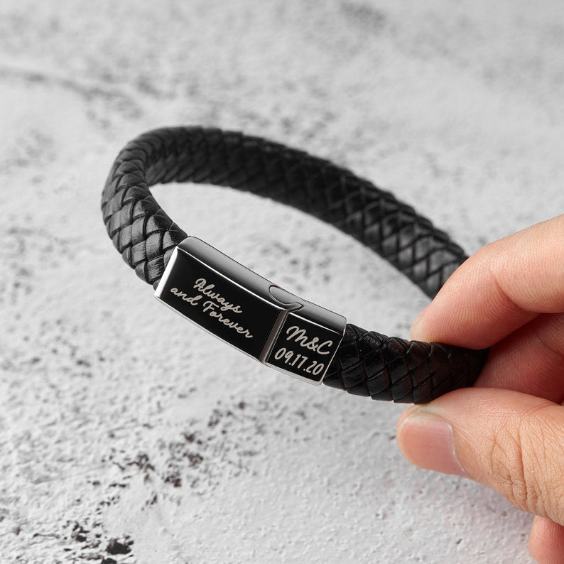 Celebrate your love and connection with our Engraved Leather Bracelet, a thoughtful piece of custom men’s jewelry designed to make him feel special. Featuring bold, masculine braided leather and a sleek metal clasp, this boyfriend bracelet can be personalized with heartfelt engravings like his name, your initials, a special date, or a meaningful message. A unique blend of style and sentiment, it’s a gift he’ll treasure forever.