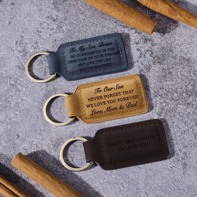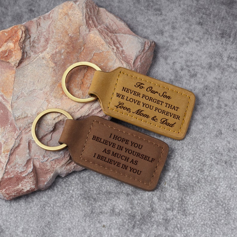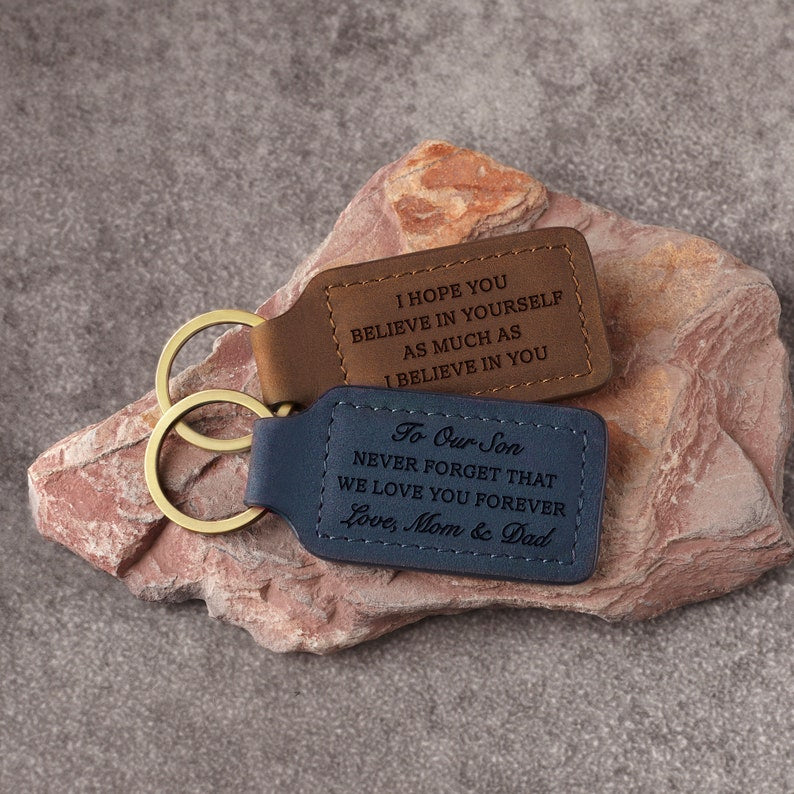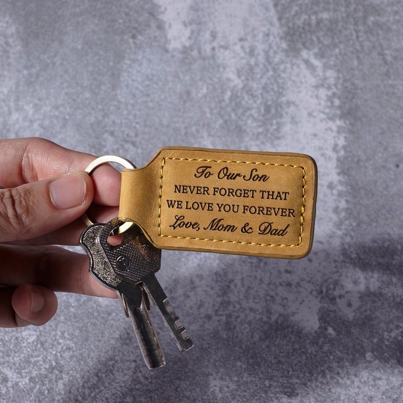 Give your son a lasting keepsake that symbolizes the precious bond you share with this personalized leather keychain. This squarish keychain can be engraved with our default message of love—"To Our Son, Never forget that we love you forever. Love, Mom & Dad"—or a message crafted from your own words on both sides, creating a cherished reminder of your connection.