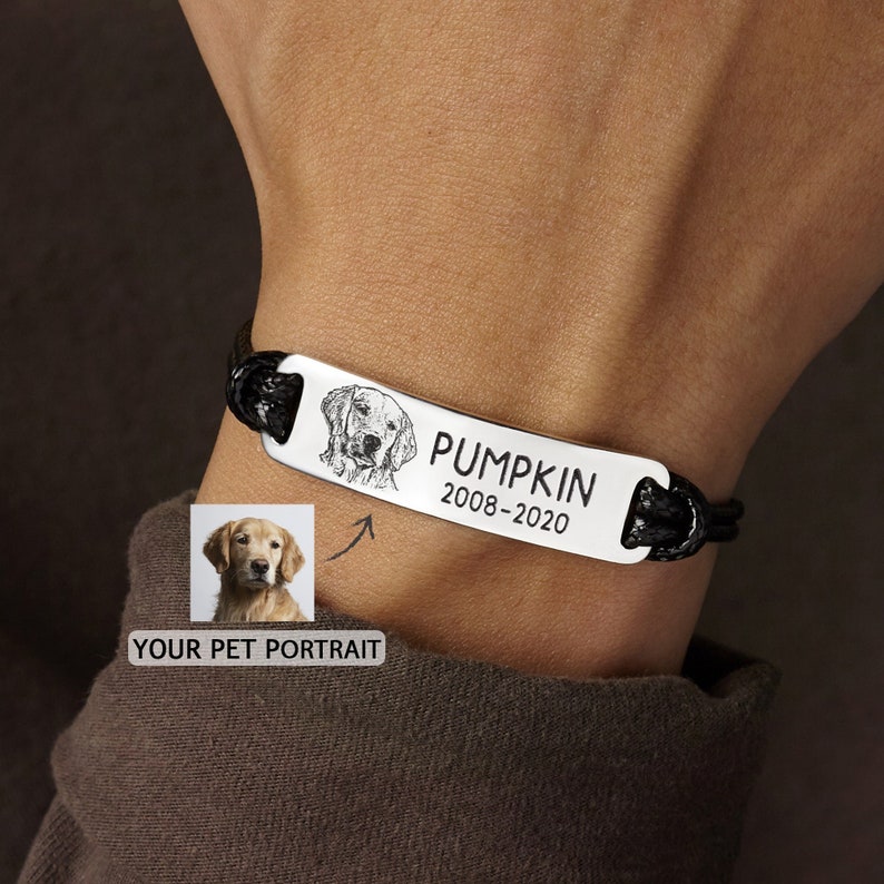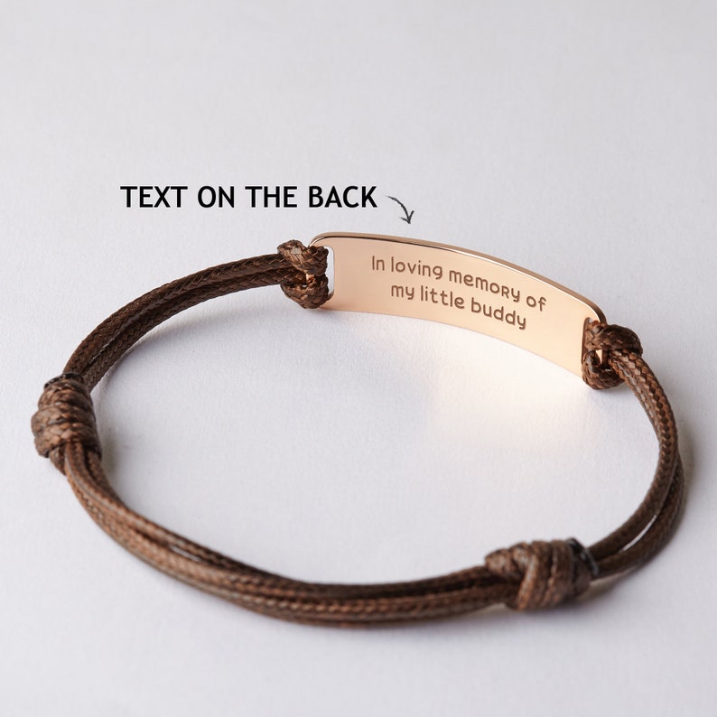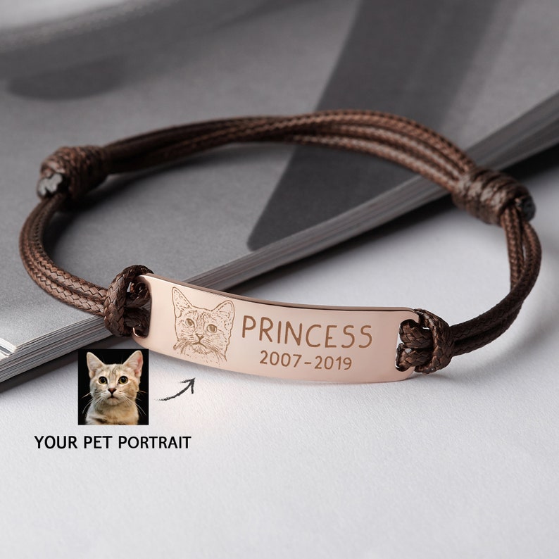 Honor their cherished companion with this Pet Loss Bracelet. Featuring a sterling silver charm engraved with a pet's portrait, name, and dates, plus an optional custom message on the back, this leather cord bracelet makes a heartfelt gift for any pet lover.