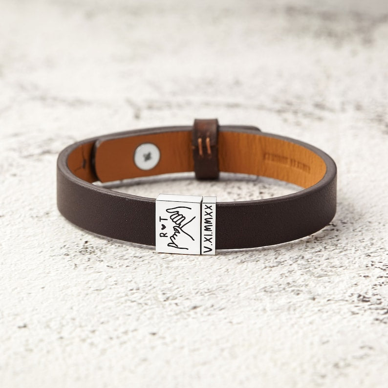 This unique men’s bracelet combines a genuine leather band with two silver charms: a small charm engraved with endearing Roman numerals to commemorate a special date, and a larger charm featuring an pinky-swear design. The blend of refined silver and sturdy leather creates a meaningful, masculine accessory that’s perfect for daily wear or special occasions. It’s an ideal, personalized gift that symbolizes both loyalty and a cherished memory.