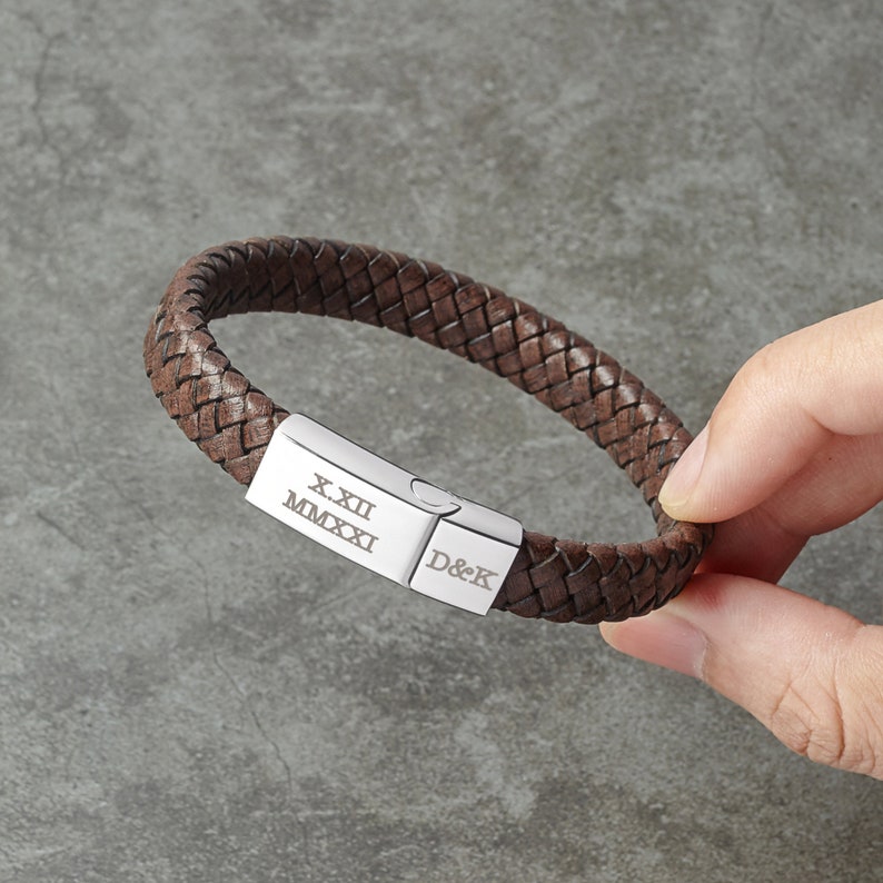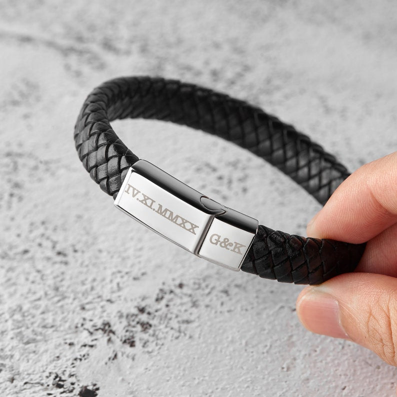 Mark a milestone in your journey together with our Roman Numerals Leather Bracelet, a stylish and meaningful piece of men’s jewelry. This men’s personalized bracelet features a bold leather band and can be engraved with a Roman numeral date that holds special meaning—your anniversary, the day you met, or another unforgettable moment. Personalize with couple initials, a name, or a short message to make it a truly unique and heartfelt custom gift for your boyfriend, husband. Perfect for any special occasion, this bracelet is a daily reminder of your love and connection.